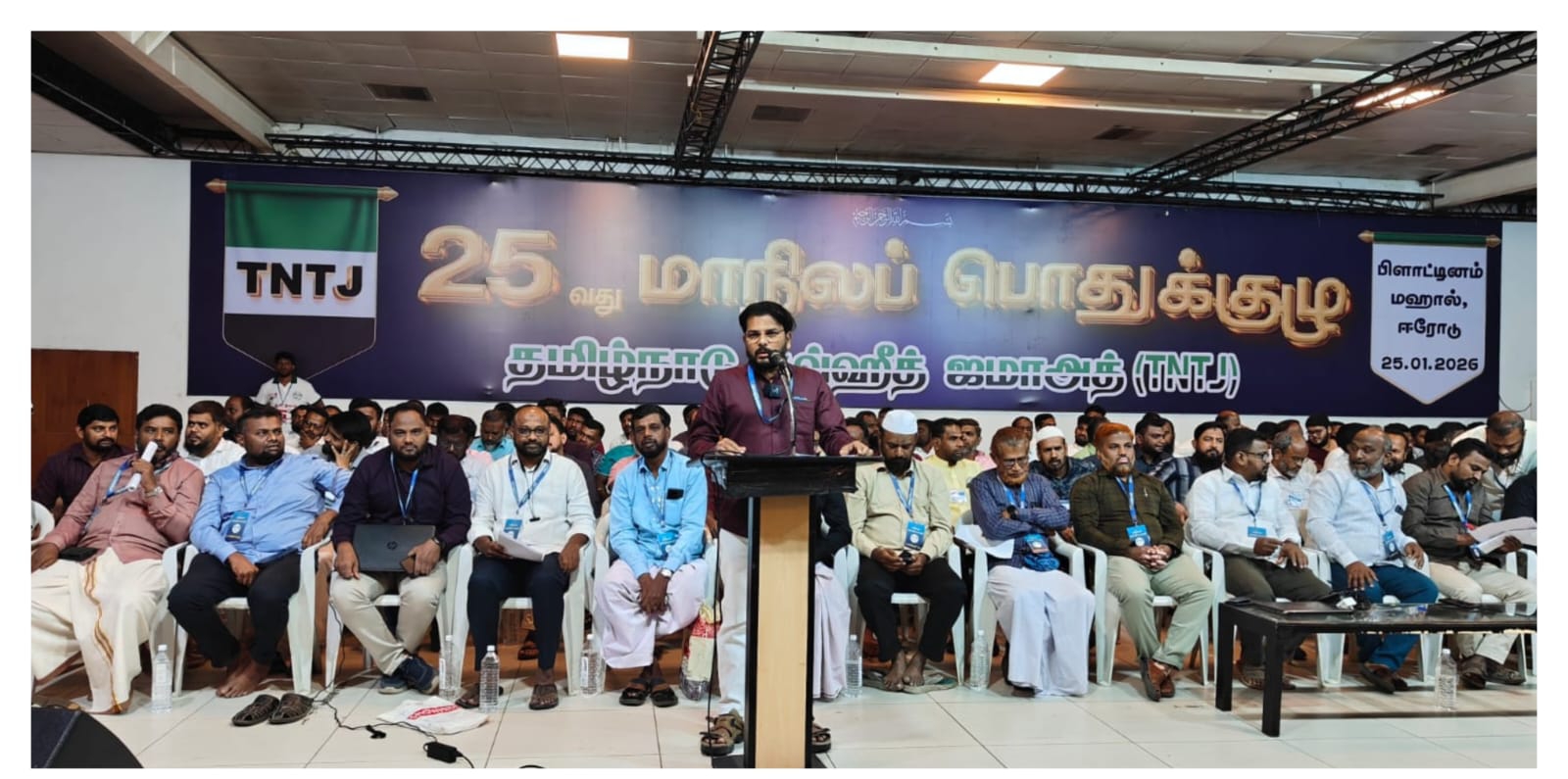 ஈரோடு மாவட்டம் பிளாட்டினம் மஹாலில் தமிழ்நாடு தவ்ஹீத் ஜமாத்தின் 25 வது மாநில பொது குழு கூட்டம் நடைபெற்று கொண்டுள்ளது. மாநில பொதுக்குழுவிற்கு மாநில மேலாண்மை குழு தலைவர் ஷம்சுல்லுஹா