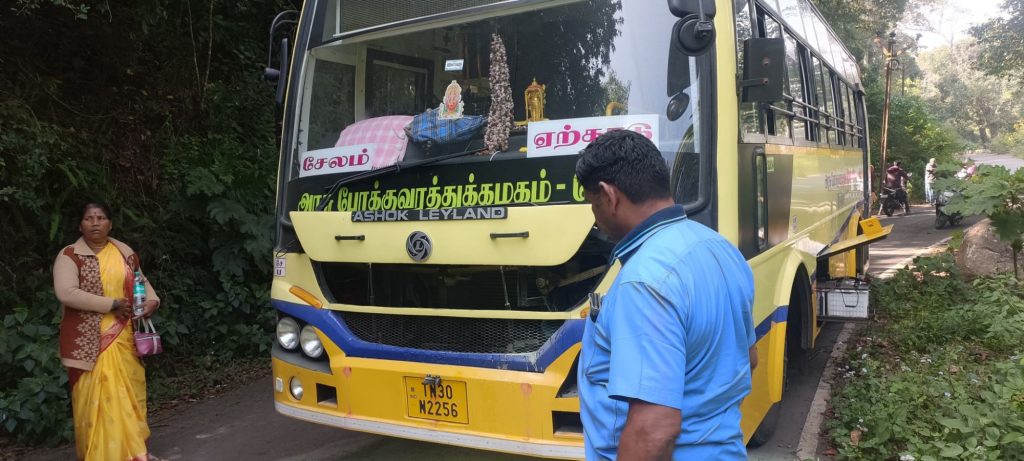 சேலம் மாவட்டம் ஏற்காடு பேருந்து நிலையத்திலிருந்து நேற்று டிசம்பர் 24-ம் தேதி ஏற்காடு வேலூர் பகுதிக்கு அரசு பேருந்து, கடுக்காமரம் வழியாக சென்று கொண்டிருந்த போது, திடீரென பேருந்தின் இன்ஜினியிலிருந்து லேசான தீ பற்றி எரிந்துள்ளது.
