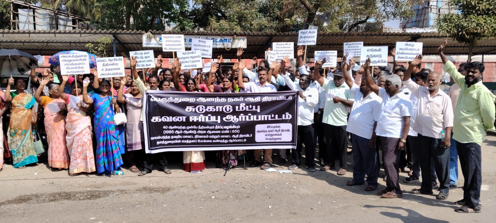 ஈரோடு மாவட்டம் பெருந்துறை புதிய பேருந்து நிலையத்தில் மயான வசதி செய்து கூறி ஆனந்த நகர் ஆதிதிராவிடர் நலப் பொதுமக்கள் சார்பாக கவன ஈர்ப்பு ஆர்ப்பாட்டம் நடைபெற்றது. ஆர்ப்பாட்டத்தில் 40 ஆண்டுகளாக மயான வசதி செய்து தராத ஈரோடு மாவட்ட நிர்வாகத்தையும் மாவட்ட ஆதிதிராவிடர் நலத்துறையின் மெத்தன போக்கையும் துறை சார்ந்த அரசு அதிகாரிகளையும் கண்டித்து கண்டன கோஷங்கள் முழங்கப்பட்டது தொடர்ந்து செய்தியாளர்களுக்கு பேட்டி அளித்த ஆனந்த நகர் ஆதிதிராவிடர் பொதுமக்கள் 1985 ஆம் ஆண்டு அரசு ஆணை எண் 851 என்ற விதியின்படி சுமார்40 ஆண்டுகளுக்கு முன்பே நீதிமன்றம் எங்கள் பகுதியான ஆனந்த நகர் ஆதிதிராவிடர் மக்கள் வாழும் பகுதிக்கு மயான வசதி செய்து தர வேண்டும் என்று தீர்ப்பு வழங்கியது. ஆனால் இவ்வளவு ஆண்டு காலம் ஆகியும் நாங்கள் இன்னமும் மயான வசதி இல்லாமல் மிகவும் சிரமப்பட்டு வருகிறோம். நாங்கள் கேட்பது வீடு கட்ட பட்டா நிலம் அல்ல, இறந்தால் புதைப்பதற்கு இடம் மட்டுமே எனவே இனியும் மாவட்ட நிர்வாகமும், அரசு அதிகாரிகளும் அலட்சிய போக்குடனும், மெத்தன போக்குடனும் நடந்து கொண்டால் நாங்கள் இன்னுமும் தீவிரமான போராட்டங்களை கையில் எடுப்போம் மேலும் தேர்தல் புறக்கணிப்பு போராட்டமும் நடத்துவோம் என தெரிவித்தனர்.