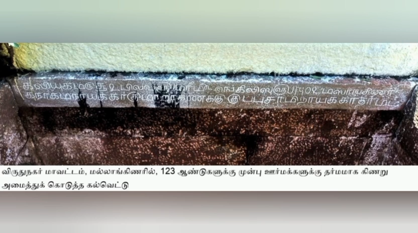விருதுநகர் மாவட்டம் அருப்புக்கோட்டை அருகே மல்லாங்கிணரில், 123 ஆண்டுகளுக்கு முன்பு ஊர்மக்களுக்கு தர்மமாக கருங்கற்களால் ஆன தண்ணீர்க் கிணறு அமைத்துக் கொடுத்த தகவல் சொல்லும் கல்வெட்டு கண்டெடுக்கப்பட்டுள்ளது.