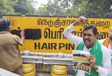 ஏற்காடு கொண்டை ஊசி எட்டாவது வளைவில் பெரியார் வலிமை என்ற பெயரை அழித்து -நாம் தமிழர் கட்சியினர் ஆர்ப்பாட்டம்.