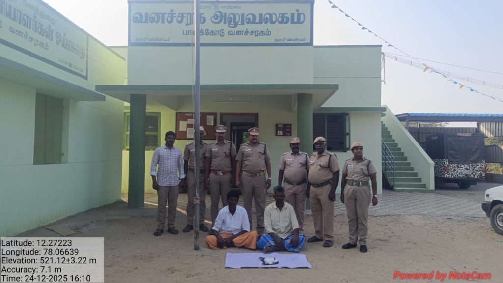 பின்பு நேற்று காலை வனவிலங்குகள் நாட்டு வெடியால் இறந்துள்ளதா என்பதை பார்க்க சேட்டு வனப்பகுதிக்கு வந்த போது ரோந்து பணியில் இருந்த பாலக்கோடு வனச்சரக பணியாளர்கள் சேட்டுவை விசாரித்து கையும் களவுமாகப் கைது செய்தனர்.மேலும் அவரிடம் இருந்து 10 நாட்டு வெடி குண்டுகளை கைப்பற்றி வழக்கு பதிவு செய்து நீதி மன்றத்தில் ஆஜர்படுத்தி சிறையில் அடைத்தனர்.