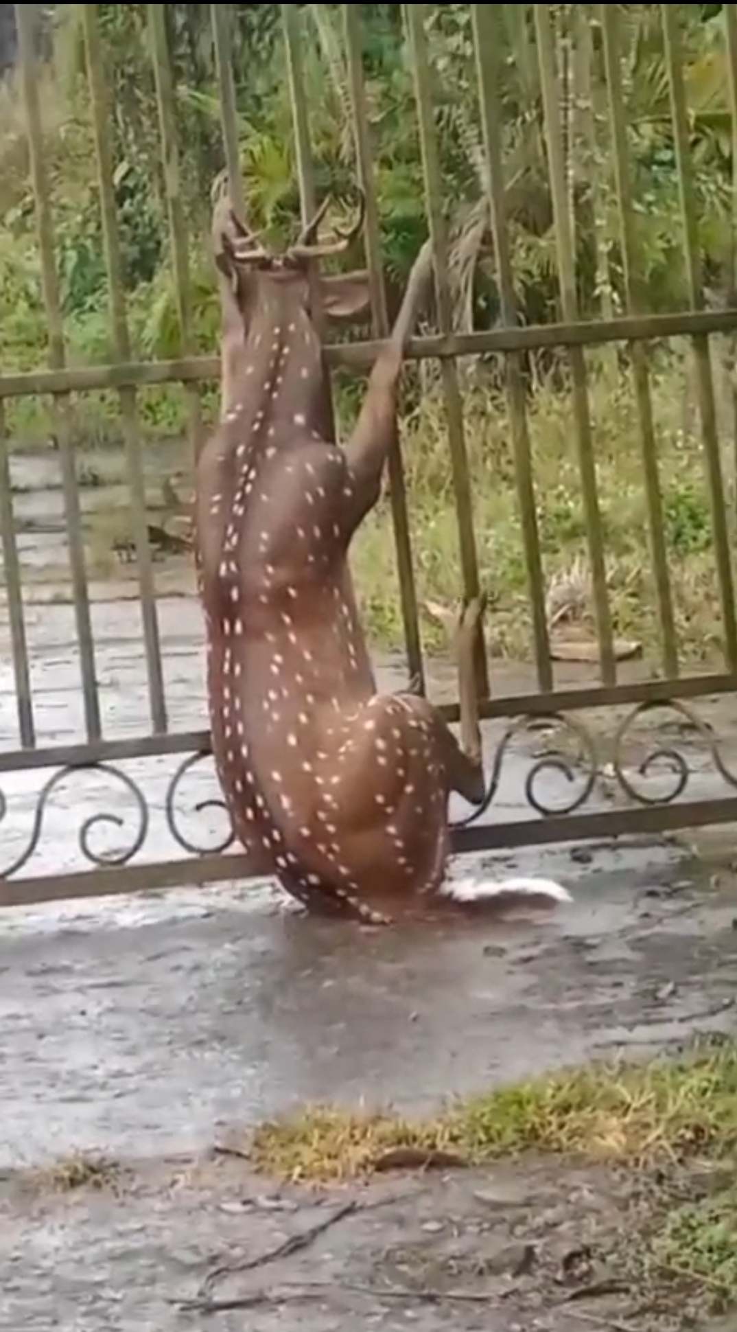 நீலகிரி மாவட்டம் அருகே உள்ள கேரள மாநிலம் வயநாடு மாவட்டம் மேப்பாடியில் தனியார் தேயிலை தோட்டத்தின் இரும்பு கேட்டில் புள்ளிமான் தலை சிக்கியதால் மான் பரிதவித்தது .