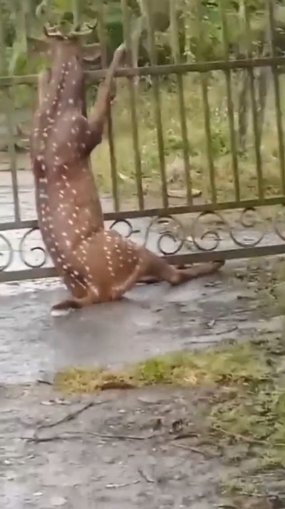 கொம்புடன் தலையும் சிக்கிக் கொண்டதால் வீட்டில் இருந்து தப்பிக்க புள்ளிமான் நீண்ட நேரம் போராடியது இந்த காட்சிகளை தேயிலை தோட்ட தொழிலாளர்கள் செல்போனில் வீடியோ பதிவு செய்துள்ளனர் அந்த வீடியோ காட்சிகள் தற்போது இணையத்தில் வைரலாகி வருகிறது.