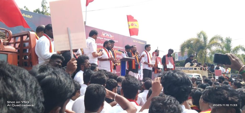 தவெக கொள்கை பரப்பு பொதுச் செயலாளர் அருண்ராஜ் தலைமையில் நடத்த இந்த ஆர்ப்பாட்டத்தில் ,