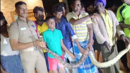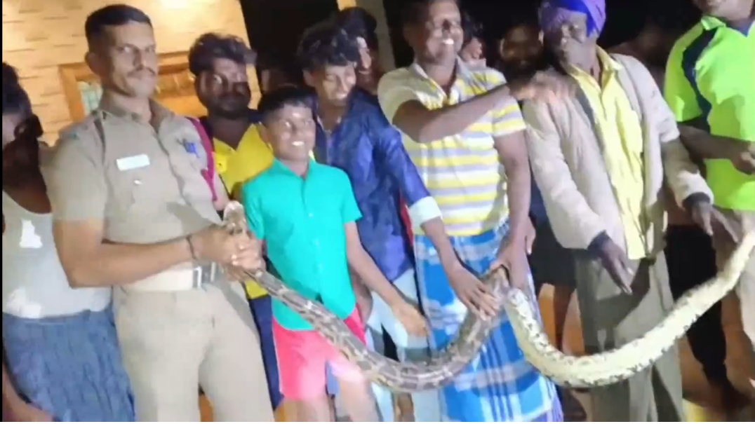 சின்ன பசிலிகுட்டை ‌ கிராமத்தில் 13 அடி நீளம் உள்ள மலைப்பாம்பை பத்திரமாக மீட்ட தீயணைப்பு துறையினர்