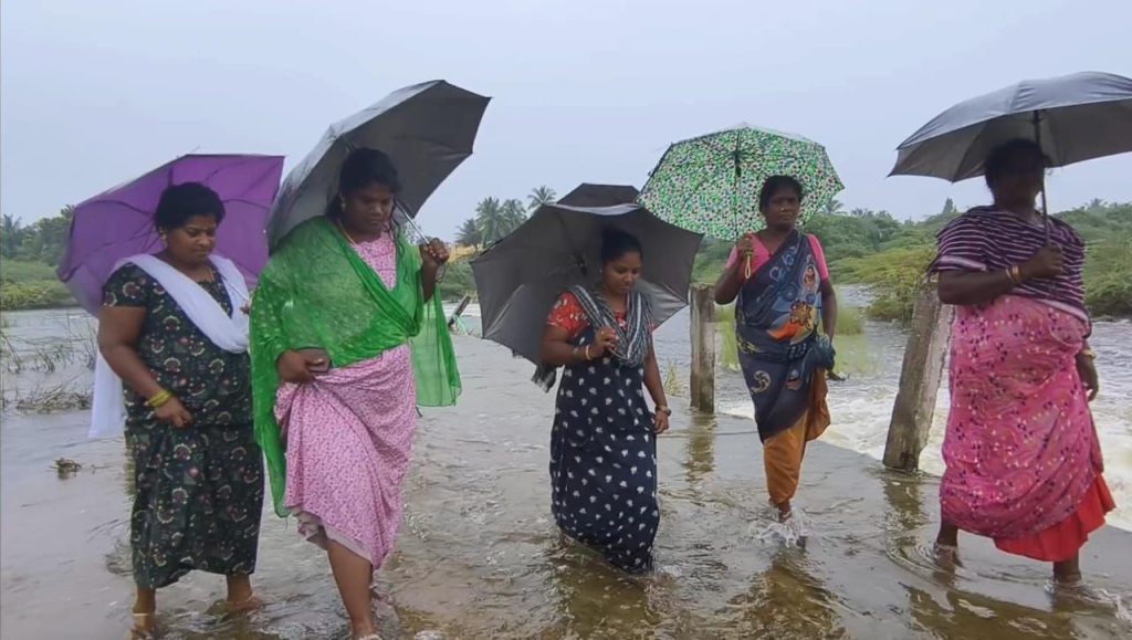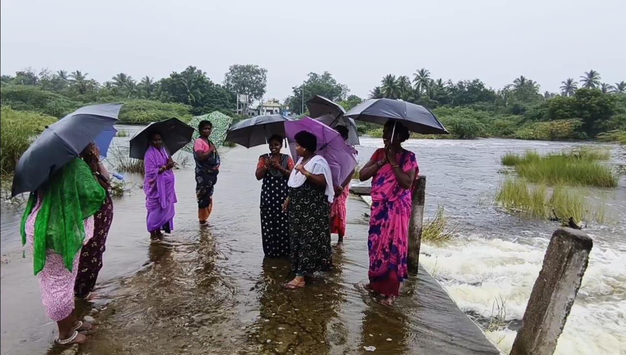 திருவள்ளூர் அடுத்த கடம்பத்தூர் அருகே ராமன் கோவில் வழியாக செல்லும் கொசஸ்தலை ஆற்றில் வெள்ளப்பெருக்கு ஏற்பட்டுள்ளது. இதனால் ராமன் கோவில் வழியாக மடத்துக்குப்பம் – குப்பம் கண்டிகை இடையே கொசஸ்தலை ஆற்றின் தரைப்பாலம் மூழ்கியுள்ளது, வருட வருடம் பருவமழை காலங்களில் தரைப்பாலம் சேதமடைந்து அப்பகுதியில் போக்குவரத்து துண்டிப்பு ஏற்படுகிறது இதனால் மடத்துக்குப்பம், குப்பகண்டிகை அக்கரக்குப்பம், செஞ்சி பணப்பாக்கம் , மணவூர், மேல்விளாகம், களியனூர், ஜாகீர் மங்கலம், தொழுதாவூர், எல்.வி.புரம் மருது வல்லிபுரம், காண்டிகை ,ராஜபத்மபுரம், இராஜரத்தனபுரம், பழையனூர், பொன்னகுளம், பகசாலை உள்ளிட்ட 20 கிராமங்களில் வசிக்கும் மக்கள் 25 கிலோமீட்டர் சுற்றி செல்லும் நிலை ஏற்படுகிறது, அதுமட்டுமின்றி ஆற்றில் வெள்ள பெருக்கு ஏற்பட்டு துண்டித்தால் அப்பகுதியில் உள்ள ரயில் தண்டவாளத்தில் ஆபத்தான முறையில் அப்பகுதி மக்கள் கடந்து சென்று வருகின்றனர், தற்போது ஆற்றின் தரைப்பாலத்தில் வெள்ள நீர் சென்று கொண்டிருக்கும் நிலையில் ஆபத்தை உணராமல் பொதுமக்கள் தரைப்பாலத்தை கடந்து சென்று வருகின்றனர். பல ஆண்டுகளாக ஏற்படும் பாதிப்பிலிருந்து மீள்வதற்கு அரசு அப்பகுதியில் உயர்மட்ட மேம்பாலம் அமைத்து தர வேண்டுமென மக்கள் கோரிக்கை வைத்துள்ளனர்