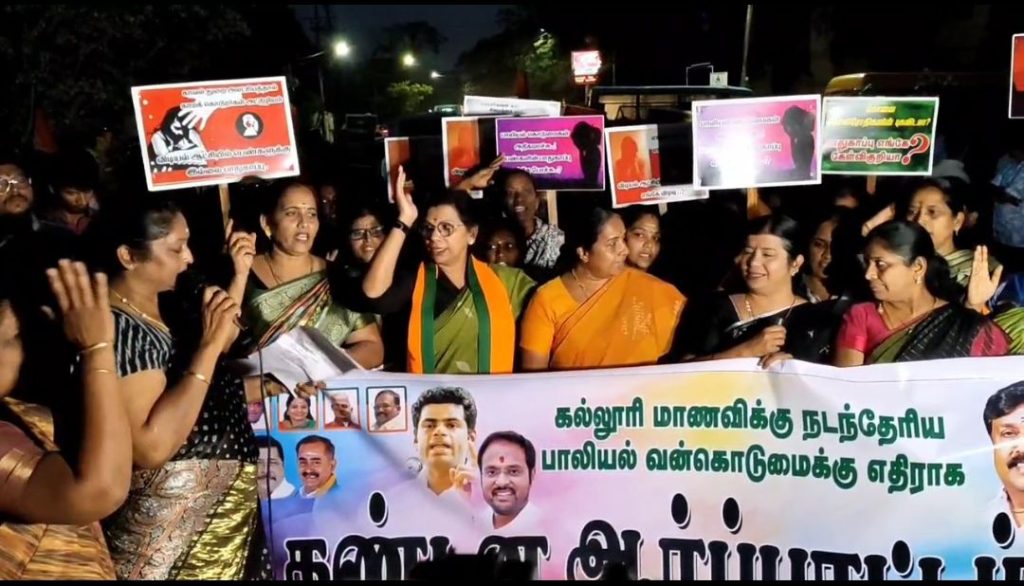 ஆர்ப்பாட்டத்தில் ஈடுபட்டவர்கள் பாலியல் சீண்டலில் ஈடுபடுபவர்களை சுட்டுக் கொள்ள சட்டம் வேண்டும் என்றும் திமுக அரசு பதவி விலக வேண்டும் எனவும் முழக்கங்களை எழுப்பினர்.
