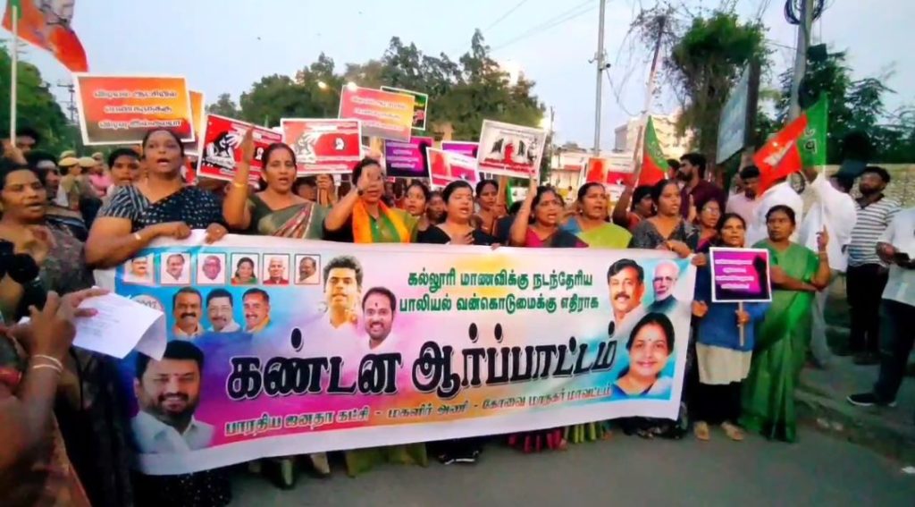இந்த சம்பவத்தை கண்டித்து கோவை தெற்கு வட்டாட்சியர் அலுவலகம் அருகில் பாஜக மகளிரணி தலைவர் வானதி சீனிவாசன் தலைமையில் ஆர்ப்பாட்டம் நடைபெற்றது. இந்த ஆர்ப்பாட்டத்தில் 50க்கும் மேற்பட்டோர் கலந்து கொண்டு கண்டன பதாகைகளை ஏந்தி முழக்கங்களை எழுப்பினர். மேலும் அந்த ஆர்ப்பாட்டத்தில் தீ பந்தங்களை ஏந்தியும் பெண்கள் பாதுகாப்பாக நடமாட வேண்டுமென்றால் பெப்பர் ஸ்ப்ரே வைத்துக் கொள்ள வேண்டும் என்பதை வலியுறுத்தி தீப்பந்தத்தை ஏந்தியும் பெப்பர் ஸ்ப்ரே வைத்தும் முழக்கங்கள் எழுப்பப்பட்டன.