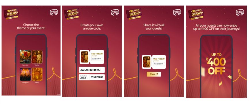 ஒரு பயனர் மாதத்திற்கு ஒரு கூப்பன் மட்டுமே உருவாக்கலாம்; இது 30 நாட்கள் செல்லுபடியாகும். நிகழ்வின் தீமைத் தேர்வு செய்து, தனித்துவமான கூப்பன் குறியீட்டை உருவாக்கி, WhatsApp மூலம் குடும்பத்தினருக்கும் நண்பர்களுக்கும் உடனடியாக பகிர முடியும். redBus பின்தள தொழில்நுட்பம் கூப்பனை பாதுகாப்பாகச் செயல்படுத்தி, புதிய மற்றும் பழைய பயனர்களை தானாகவே வேறுபடுத்தி, பொருத்தமான தள்ளுபடியை வழங்குகிறது.
