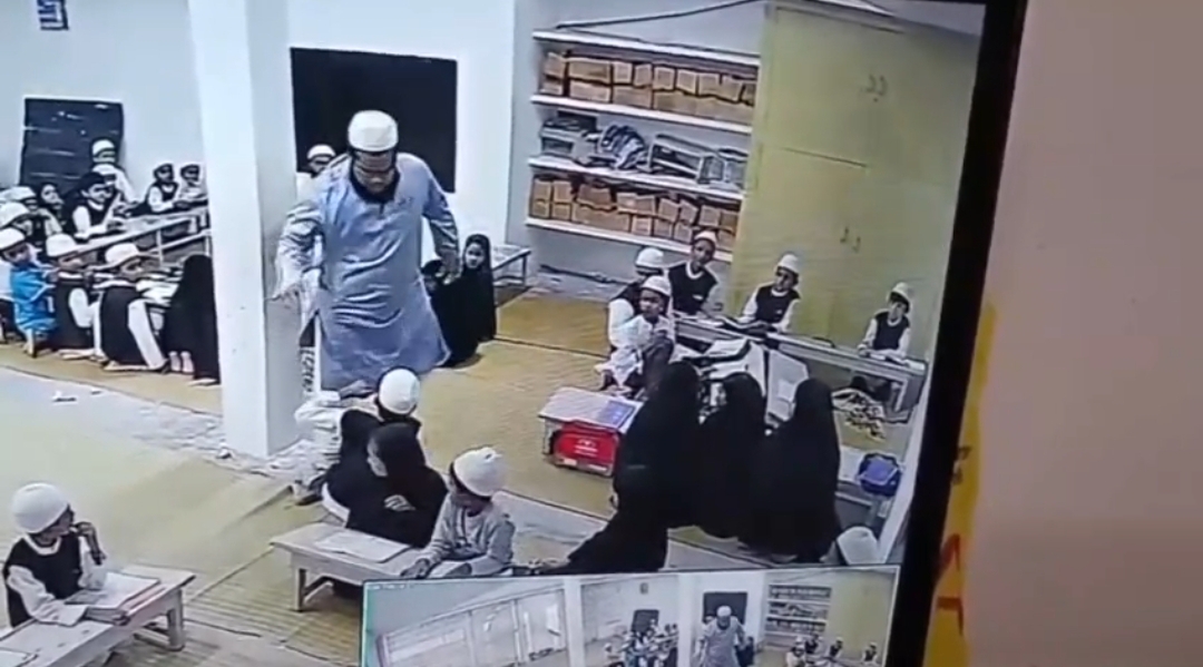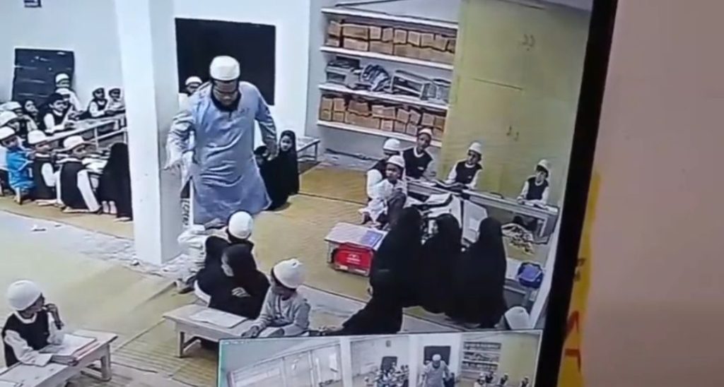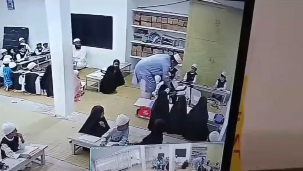 திருப்பத்தூர் மாவட்டம் வாணியம்பாடி நகர பகுதியில் இசுலாமியர்கள் அதிகமாக வசித்து வரும் நிலையில் இவர்கள் மதம் சார்ந்து அறிவு மற்றும் ஒழுக்கத்தை போதிக்கும் வகையில் பல மதரசா பள்ளிகள் செயல்பட்டு வருகிறது.இதில் இசுலாமிய மதம் சார்ந்த உபதேசங்கள் மற்றும் குரான் வசனங்கள் உள்ளிட்டவற்றை மாணவர்கள் பயில்கின்றனர்.இதற்காக வாணியம்பாடி பஷிராபாத் மசுதியின் மேல் தளத்தில் செயல்பட்டு வரும் மதரசா பள்ளிகள் 60 மாணவ மாணவிகள் பயின்று வருகின்றனர் இதில் நான்கு ஆசிரியர் பணியாற்றி வரும் நிலையில் ஆசிரியர் ஒருவர் மாணவர்களை கடுமையாக தாக்கும் வீடியோ ஒன்று தற்போது சமுக ஊடகங்களில் வைரலாகி வருகிறது.இதில் ஆசிரியர் மாணவர்களை கடுமையாக தாக்கும் காட்சிகள் இடம் பெற்றுள்ளது.இதை பார்த்து அதிர்ச்சி அடைந்த பெற்றோர்களின் கடுமையான கூட்டங்களுக்கு பிறகு சம்மந்தப்பட்ட ஆசிரியர் பணியில் இருந்து விடுவிக்கபட்டதாக சம்மந்தப்பட்ட மதரசா நிர்வாகிகள் தெரிவித்துள்ளனர்.சம்மந்தப்பட்ட அந்த ஆசிரியர் வாணியம்பாடி ஷாகிராபாத் பகுதியை சேர்ந்த சுஹேப் என கூறப்படும் நிலையில் மதரசா நிர்வாகிகள் ஆசிரியரின் விவரங்களை கூற மறுத்து விட்டனர்.