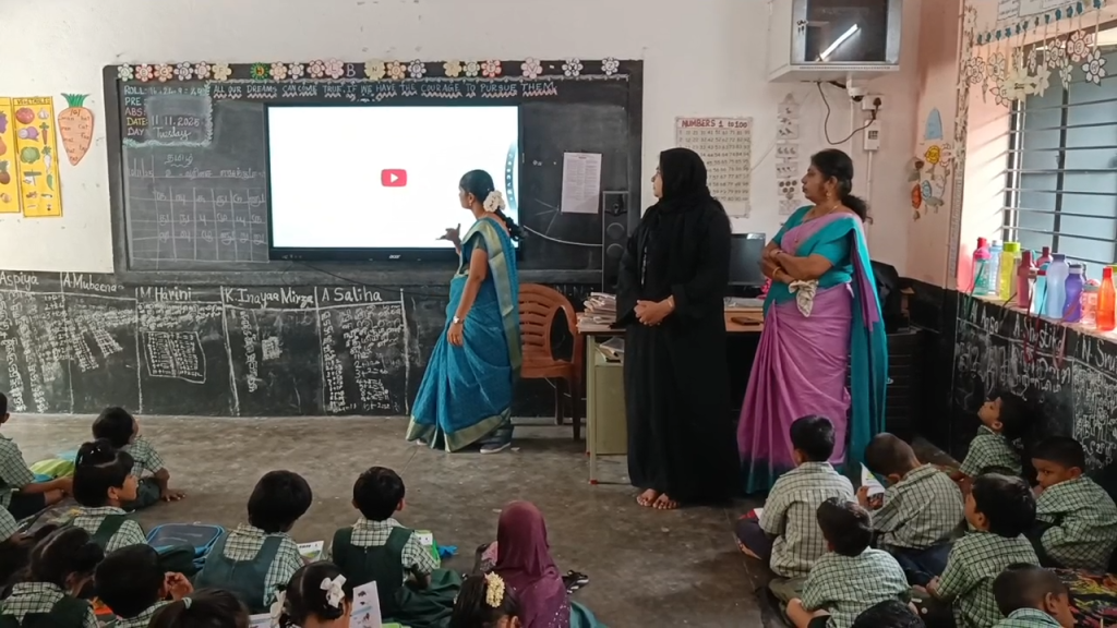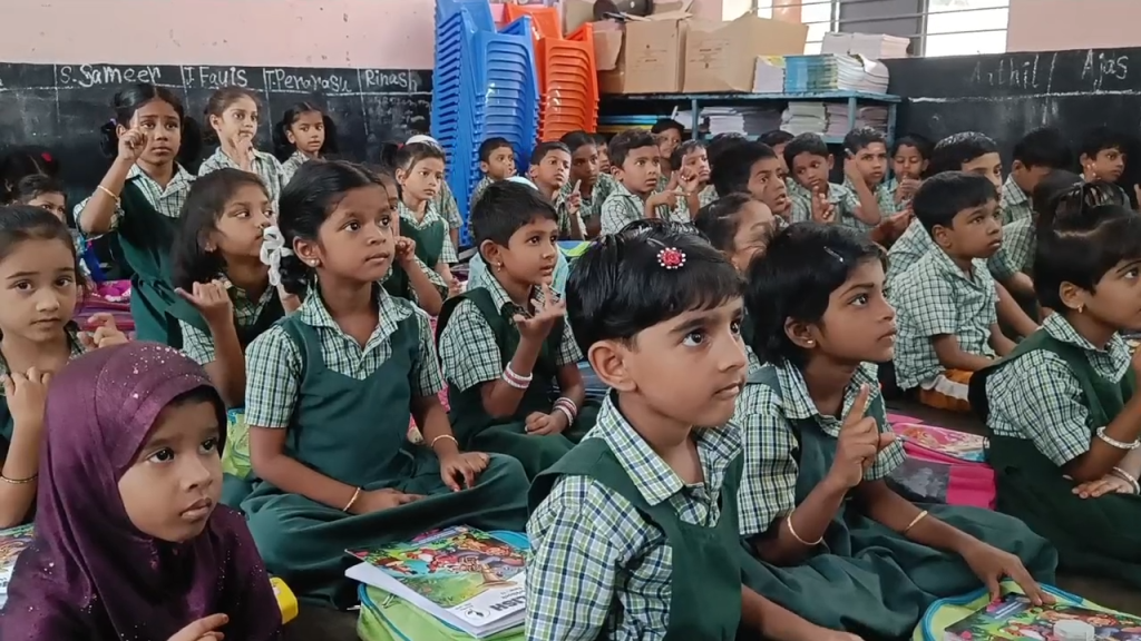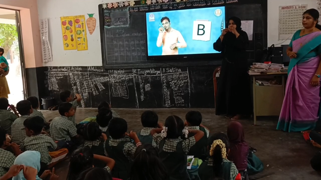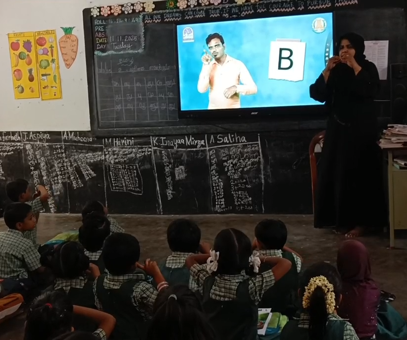 திருப்பூர் நொய்யல் வீதியில் உள்ள மாநகராட்சி அரசு தொடக்கப் பள்ளியில் ஒன்று முதல் ஐந்தாம் வகுப்பு வரையிலான மாணவ மாணவிகளுக்கு வீடியோக்கள் மூலம் சைகை மொழி பாடம் கற்பிப்பு.
