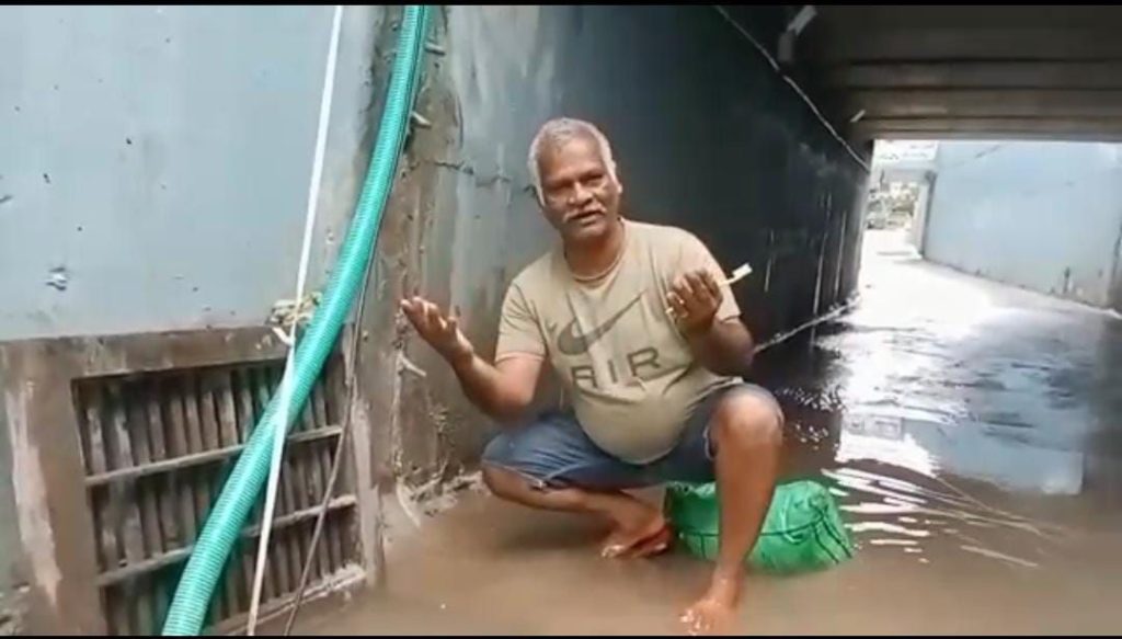 புதுச்சேரி நூறடி சாலையில் உள்ள ரயில்வே மேம்பாலத்தின் கீழ் பகுதியில் சுரங்க பாதை அமைக்கப்பட்டு ஆட்டோ, இருசக்கர வாகனங்கள் சென்று வருகிறது. இந்நிலையில் கடந்த சில நாட்களுக்கு முன்னர் பெய்த கனமழையின்போது சுரங்கப்பாதையில் தண்ணீர் நிரம்பியதால் வாகனங்கள் செல்ல தடைவிதிக்கப்பட்டது. இந்நிலையில் சமூக ஆர்வலர் சுத்தம் சுந்தரராஜன் இன்று சுரங்கப்பாதையில் அமர்ந்து பல்துலக்கும் நூதன போராட்டம் நடத்தினார். அப்போது, அவர் கூறுகையில், நூறடி சாலையில் கட்டப்பட்டுள்ள மேம்பாலம் தரமற்றவையாக உள்ளது. இதனால் மழைநீர் சுவர்களில் கசிந்து சுரங்கப்பாதைக்கு வருகிறது. இந்நிலை நீடித்தால் சுவர் விரைவில் வலுவிழந்து சேதமடையும் நிலை ஏற்படும். இதனை கண்டித்தும், இன்னும் இரண்டு மேம்பாலங்கள் கட்டப்படவுள்ளதை குடியரசு தலைவர் மேற்பார்வையில் தரமாக கட்டவேண்டும் என வலியுறுத்தியும் போராட்டம் நடத்துவதாக அவர் தெரிவித்தார்.
