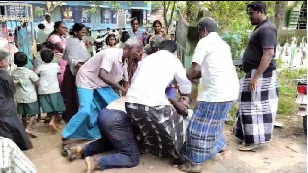 இதில் பெற்றோர் தரப்பிற்கும் முருகேசனுக்கும் வாக்குவாதம் முற்றிய நிலையில் தள்ளுமுள்ளு கைகலப்பு .ஏற்பட்டதோடு இவ ர்கள் ஒருவருக்கொருவர் சட்டையை பிடித்து கிழிதத்து அவரை கீழே தள்ளி கட்டி உருண்டதால் அப்பகுதியில் பரபரப்பு ஏற்பட்ட து.