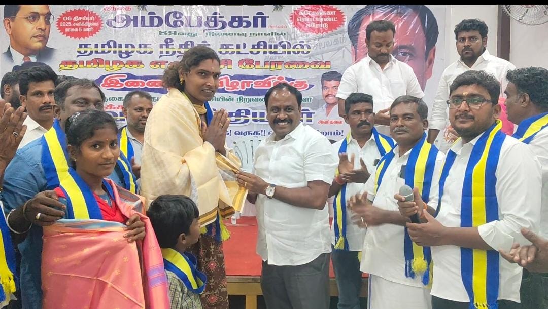 ஈரோடு சம்பத் நகரில் உள்ள கடோட் கஜா ரெஸ்டாரண்டில் அம்பேத்கரின் 69 ஆவது நினைவு நாளை முன்னிட்டு தமிழக நீதிக்கட்சியில் தமிழக எழுச்சிப் பேரவை இணைப்பு விழா நடைபெற்றது. தமிழக எழுச்சி பேரவையின் தலைவர் பிரபாகரன் தலைமையில் நடைபெற்ற விழாவில் தமிழக எழுச்சிப் பேரவை மாநில பொதுச் செயலாளர் பெருமாள் உட்பட கட்சியின் அனைத்து நிர்வாகிகளும் உறுப்பினர்களும் மகளிர் அணியினர் தொண்டர்கள் உட்பட 500க்கும் மேற்பட்டோர் அனைவரும் தமிழக நீதிக்கட்சியில் இணைந்தனர். இந்நிகழ்வில் தமிழக நீதி கட்சியின் தலைவர் மற்றும் நிறுவனர் வாழவந்தியார் கலந்துகொண்டு இணைப்பு விழாவிற்கு வருகை தந்த அனைவரையும் வரவேற்றார் மேலும் கட்சியின் அனைத்து நிர்வாகிகளும் நிகழ்வில் கலந்து கொண்டனர்.