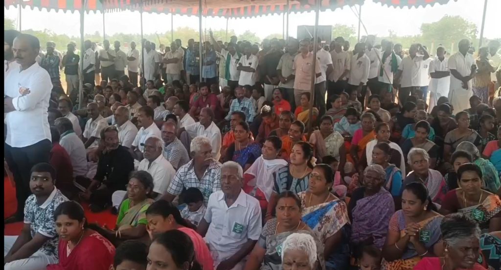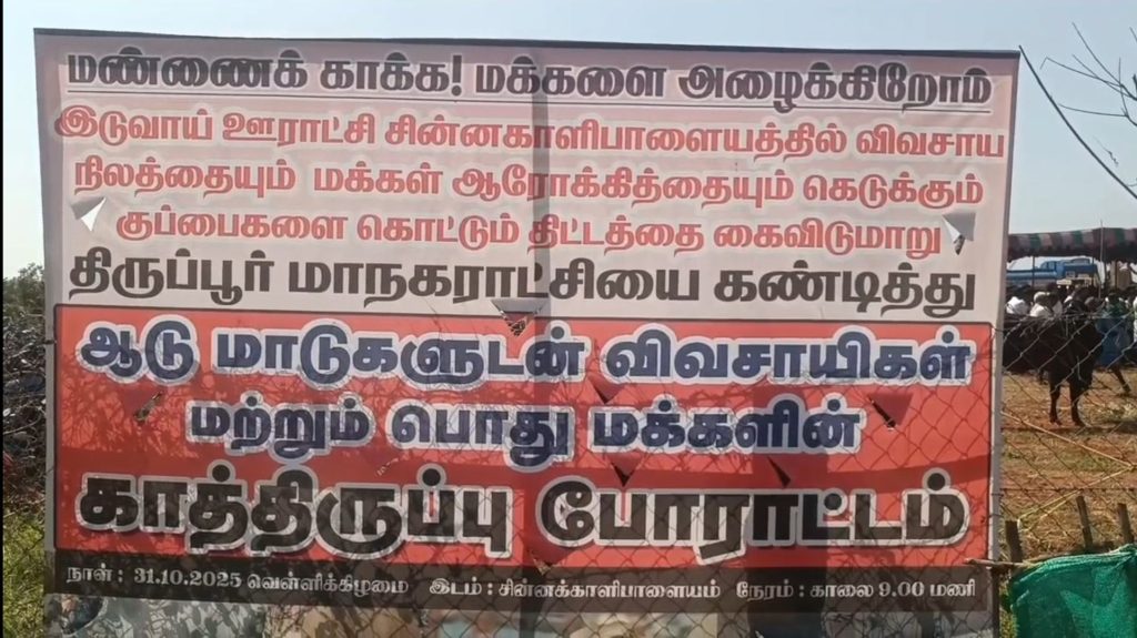 திருப்பூர் அருகே இடுவாய் கிராமத்தில் உள்ள சின்ன காளிபாளையம் பகுதியில் மாநகராட்சி நிர்வாகத்தினர் குப்பை கிடங்கு அமைக்க எதிர்ப்பு தெரிவித்து அப்பகுதி மக்கள் 700க்கும் மேற்பட்டோர், மாடுகளுடன் போராட்டத்தில் ஈடுபட்டுள்ளனர்.