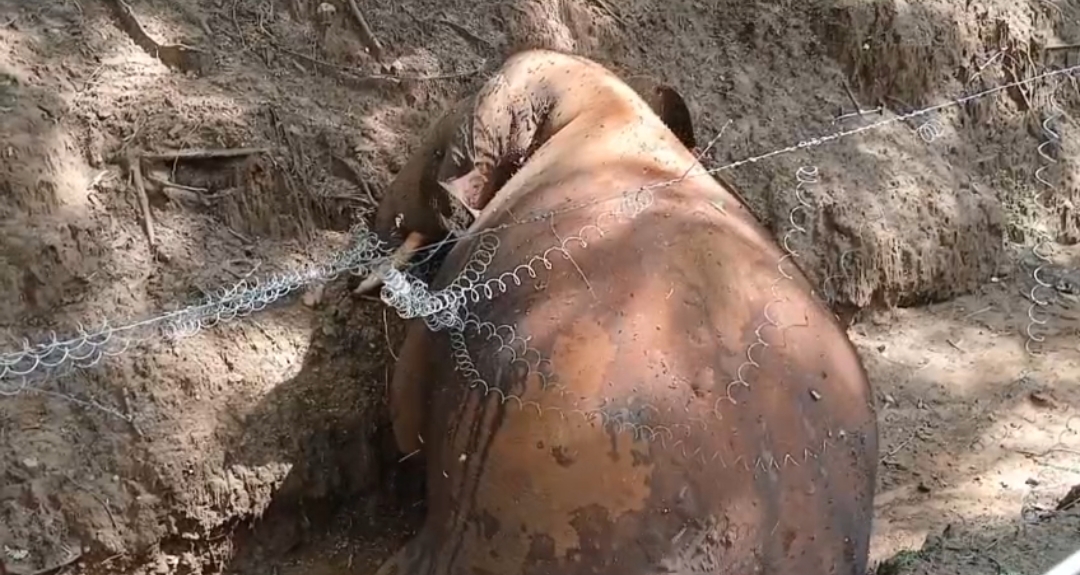 திருமலை ராஜன் என்பவருக்கு சொந்தமான பாக்கு தோப்பில், பாதுகாப்புக்காக சுருக்கு மடி மின் வேலி அமைக்கப்பட்டுள்ள நிலையில் அதன் அருகே வனவிலங்குகள் வெளியேறாமல் இருக்க வனத்துறை சார்பில் அமைக்கப்பட்ட அகழிகளும் உள்ளது .